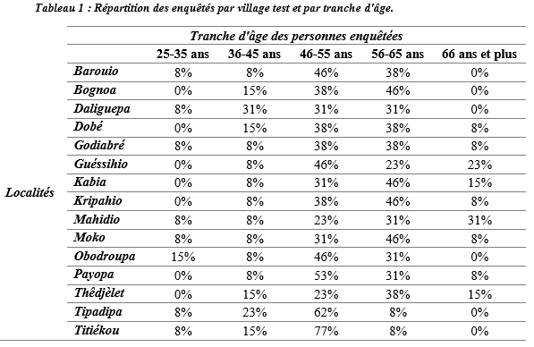 15 villages sur un total de 52 ont été choisis en se basant sur la disponibilité des données agricoles générales couvrant une importante période. Ces enquêtés sont répartis selon les tranches d’âge suivantes :