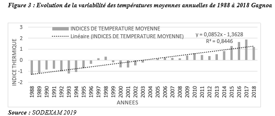 De l’analyse de cette figure, il ressort une tendance générale à la hausse des températures de 1988 à 2018. De façon générale, la température moyenne annuelle a connu une augmentation de l’ordre de 1,18°C sur la période de notre étude. Ce taux de réchauffement de la zone d’étude est plus élevé que celui de l’intervalle 0,2 à 1°C dans lequel le GIEC (2007) situe globalement l’Afrique de l’ouest. Par ailleurs, cette situation d’augmentation de la température à des conséquences considérables sur la culture du riz pluvial (ADRAO, 2008). Alors que la température de notre zone d’étude ne cesse d’augmenter. Elle est passée ces dernières années de 25.67 à 26.85°C.
